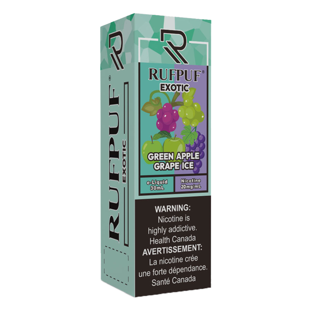 Rufpuf Green Apple Grape Ice blends tart green apples and sweet grapes with a refreshing icy finish. Available in 20, 35, and 50mg nicotine salt, it offers smooth, satisfying hits. The 30ml bottle has a 50/50 VG/PG ratio for rich flavor and smooth vapor. Rufpuf is a trusted Canadian brand known for high-quality, bold-flavored vape juice.